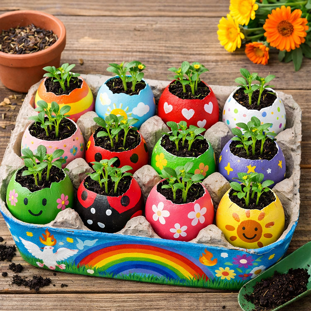 Tras volver de vacaciones, celebraremos Pascua de otra forma: sembraremos plantitas (caléndulas, flores comestibles color anaranjado Flaming Holy Spirit) en huevos de Pascua, para sembrarlas en tiestos pintados a mano por ellos en Pentecostés, signo de loveful harvest, de cultivar cultura de nueva vida. Esta es una foto del proyecto que vamos a hacer en Pascua para transplantar las plantitas a tiestos en Pentecostés: