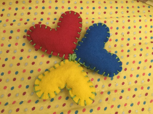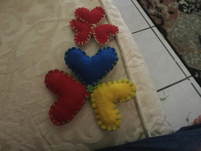 In the actual goeiz, the unity of the three hearts still mean “helping to grow in communion”: helping to grow everyone as a brother and a sister of the human family. Three different colors means diversity. The same size of the hearts means equality. The use of the three primary colors means that these are the most basic principles of our humanity: respecting each other as human beings unconditionally, recognizing all human rights of everyone unconditionally, seeing unconditionally in everyone a brother and a sister. The color blue is faith, the color red is love and the color yellow is hope. The color green of the thread is life. I used the primary colors because those are the colors that make possible ALL other colors. I only used the form of hearts as a symbol that all persons must be unconditionally loved as a member of the human family. It is hand made —it is artisan-made— because human pride is “hand made”: it is upon us to walk together hand by hand as one humanity, as brothers and sisters that respect everyone’s human rights unconditionally and help to grow each other in communion unconditionally.