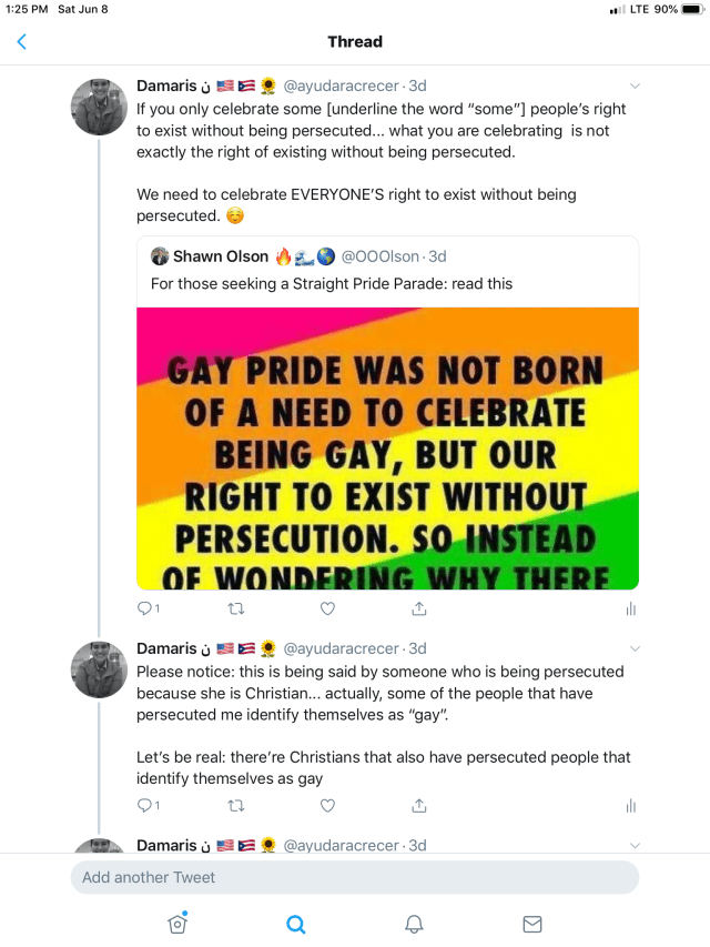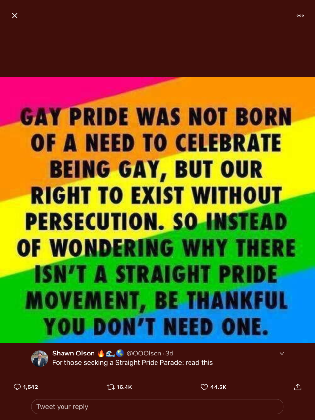 While using Twitter, I read that someone was proposing a “straight pride” parade. Among the reactions to that idea was an image that explained that the “gay pride parades” celebrated the right of gay people to exist without being persecuted.