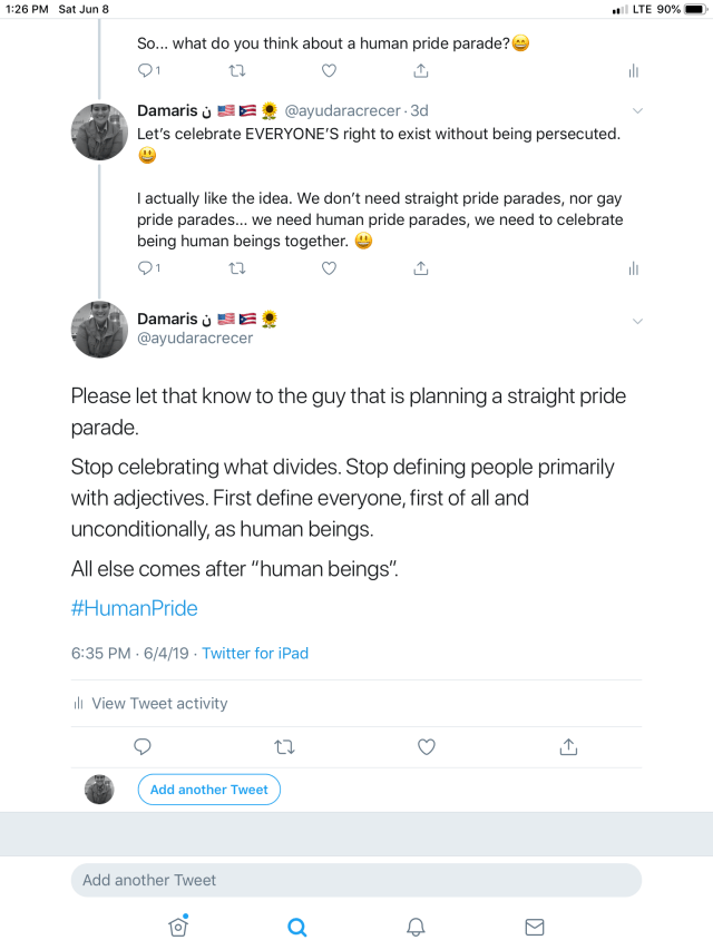 Suddenly, it is SO necessary to remember: EVERYONE is a human being, everyone is entitled to human rights. Suddenly, it is so necessary to remember that we all must respect each other as human beings, no matter what. Suddenly, it is necessary to remember that we all must help each other to grow in communion, as brothers and sisters, that we are all equal, that we are all one humanity. Suddenly, it is SO necessary to celebrate our human pride: we all are human beings, we all must respect each other as human beings, we all must called to grow unconditionally and become the best person we can be. This is human pride: celebrating that everyone is a human being, a brother and a sister with human rights.