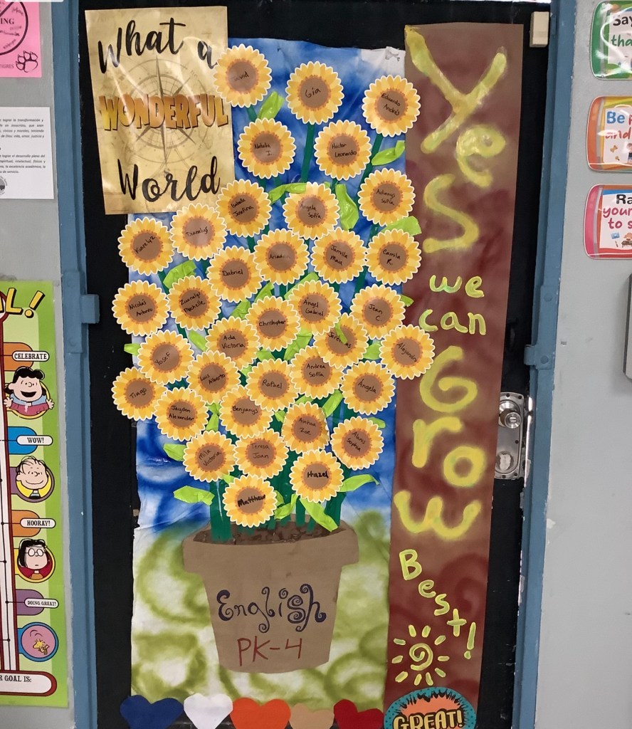 ¿Saben quienes son mis mejores maestros del sueño americano? Por supuesto, mis estudiantes, que también son mi mayor razón para dar gracias. Como todos saben, doy clases de inglés entre los grados PK-4. Pues yo de mis estudiantes aprendo día a día a que realmente todos tienen la oportunidad de crecer como la mejor persona que puedan ser. Realmente son muy ocurrentes en sus formas de aprender a crecer, y con la guía adecuada —que la tienen— serán todos grandes personas de bien. Desde muy temprano en la vida todos merecen las oportunidades de crecimiento que tienen mis estudiantes: una escuela en la que pueden desarrollarse como personas de bien, papás, mamás y abuelos que les cuidan y están al pendiente de ellos, espacios para jugar y crecer como la mejor persona que puedan ser con la ayuda de Dios Amor… Sí, doy clases en una escuela católica, así que Dios Amor es parte fundamental del crecimiento de mis estudiantes. Incluso, en mi clase han ido a rezar delante de la eucaristía. Este pasado 19 de noviembre —Día del Descubrimiento de Puerto Rico y día de Nuestra Señora de la Divina Providencia— lo celebré regalándole a la Virgen un girasol por cada uno de mis estudiantes. Nuestra escuela es una escuela a la que definitivamente le faltan recursos, pero si se logra que haya una fundación que ayude a compensar la falta de recursos, lograremos que nuestros estudiantes tengan todas las oportunidades de crecimiento posibles…