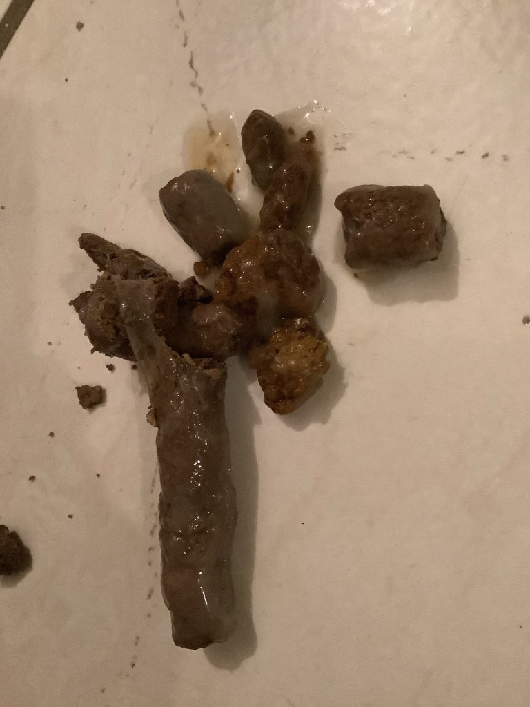 He also made a very strange poop, covered in a thick mucus. It has happened to me also, but not right now. I should have notice that Poppy, the dog that is vomitating and making strange poop, is in the floor. It is a fact that the lower the altitude, the most damage toxic gasses do. I am trying to put him in the bed.