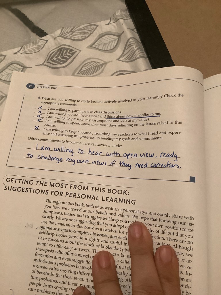 The authors also say that “This course is likely to be different from many of the courses you have taken. Few courses deal primarily with you as subject matter. Most college courses challenge you intellectually, but this book is geared toward integrating intellectual and personal learning. To a large degree, what you get frok this course depend on what you are willing to invest of yourself”. I would have loved to take such kind of course. I have never taken a course like this, and I am glad of finding this book. 🙂