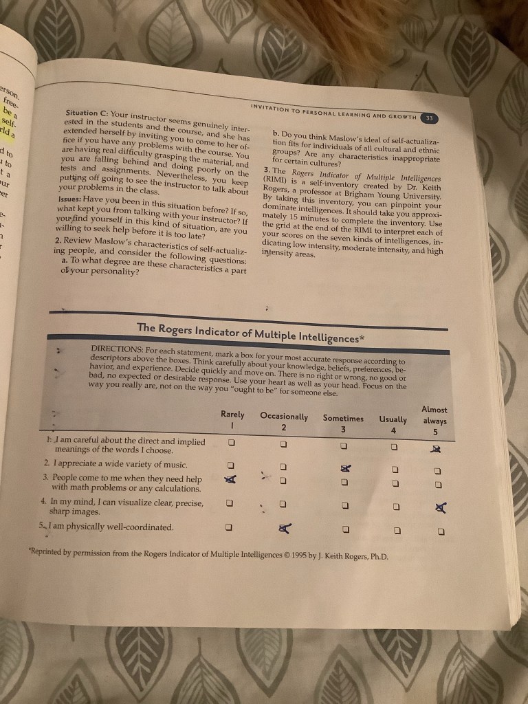 “Do bot feel compelled to complete all the activities; select those that have the most meaning for you at this time in your life”…. Ahhhhhhhhh, a class that actually cares for what it means to you what you study/do… 😲