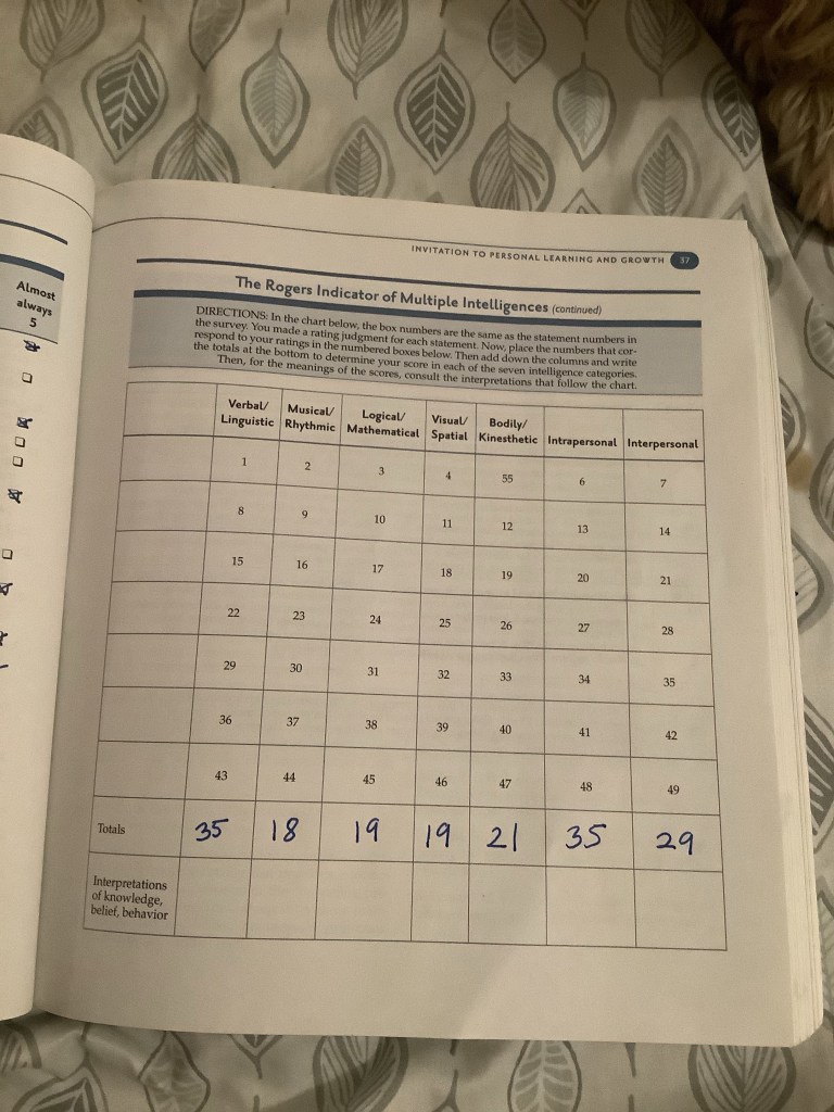 The book offers the Rogers Indicator of Multiple Intelligence scale. I did the test, I made all the calculations and I got perfect score in two multiple intelligences: verbal and intrapersonal. I am surprised to see such a low score in visual/spatial (19) because I have always thought I learn better visual/spatially.