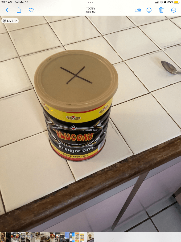 Then, right after that, I needed to make more coffee because I drank it all today. If you see my coffee mug, it is a giant mug, it is very hard to drink it all, but today my progenitors left and I could drink it all. Well, my progenitors made one of their moves and at some moment of the week they drawed a cross in the raw coffee can. You can see the picture here. They are even mimicking my longer-horizontal cross
