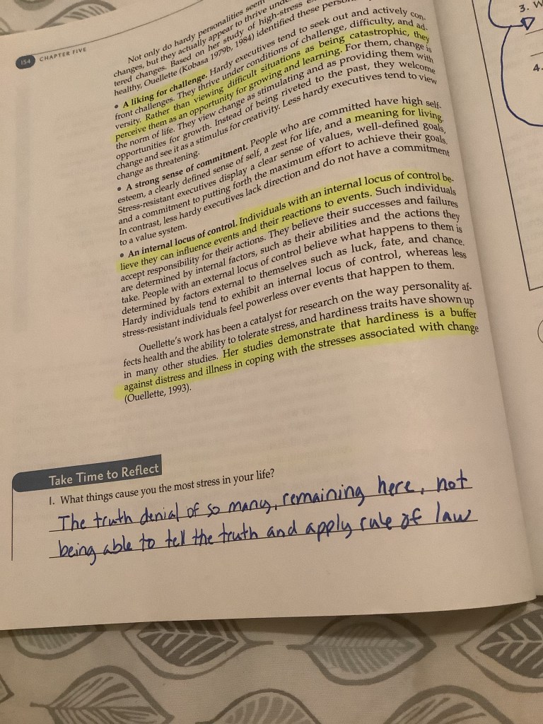 “Hardiness is a buffer against distress and illness in coping with the stresses associated with change”. Well, that is a problem with me. I never become “hard”, nit even as a teacher. I don’t scream, impose, employ brute force… its simply not me.