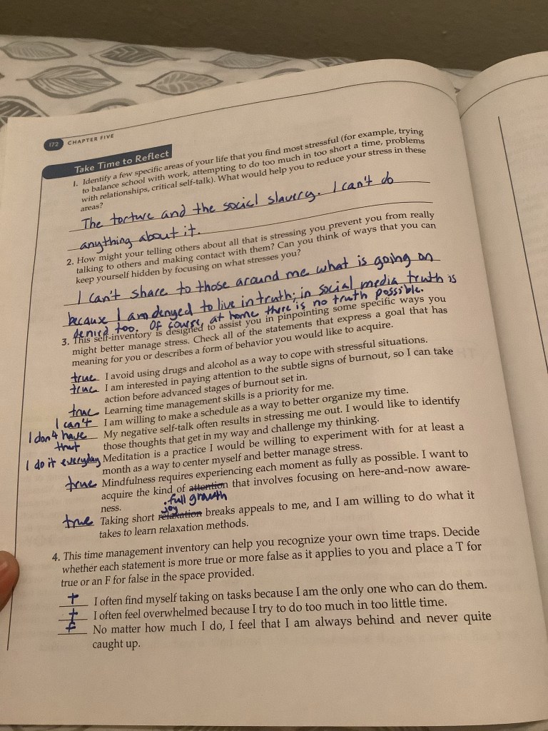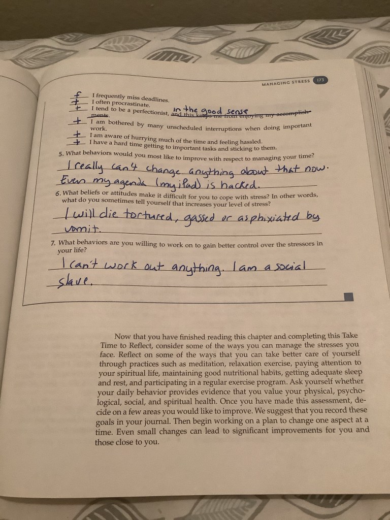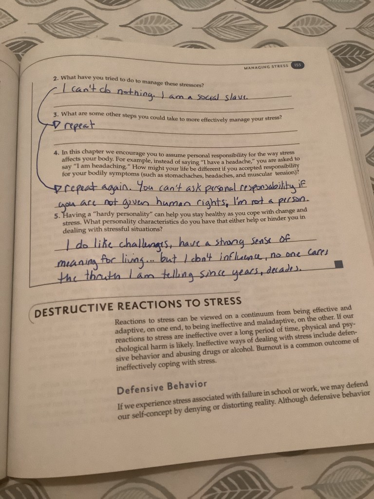 “Identify some environmental sources of stress or other stresses that are externa, to you”. Nope. If they know what causes me more stress, more than what they already know, they will use it as a weapon. They will do/cause precisely that. Nope, I won’t answer this question.