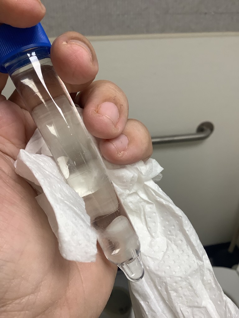 This was my urine sample. It is a other very recurrent symptom: increase of peeing, causing transparent pee. My last urine before that sample was less than an hour ago.