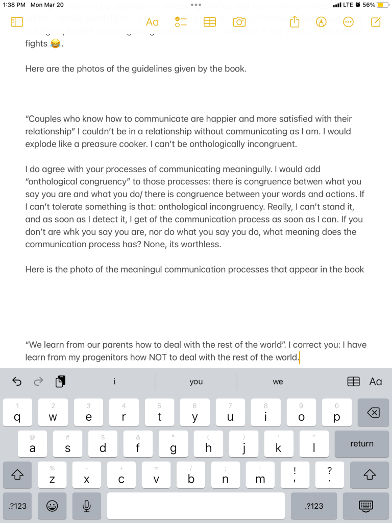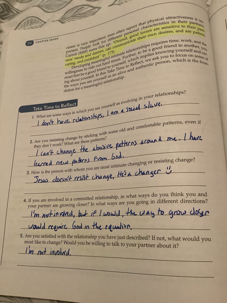 “As you read the remainder of this chapter, spend some time [4] thinking about ways you experience intimacy in your life. [1] Are you involved in the kinds of relationship that satisfy you? [2] What are you willing to do to improve your relationships? [3] What are your view of a meaninful relatioship?” Easy here, too many questions at the same time. 😂 1. Well, my relationship with my students does satisfy me, they are great kids, although sometimes unruly, but its normal for their age. I love to teach them. My relationship with God (with Jesus Charity, with the Holy Family of the New Albow, with Mik..) also satisfies me A LOT, its the meaning and direction of my life. Besides those two kind of relationships, I have no other relationship. I am deeply isolated socially due my progenitors’ control. I can’t have relationships online (in dating sites) fue their hacking, nor in the parish (they collaborate with their abuse), nor with doctors and professional (I am not believed), nor in the family (they all collaborate in their abuse…) nor with neighbours (they also collaborate in the abuse…) and technically, I can’t have a real relationship with my colleagues due needing to lie constanly to cover up the reality of my social slavery… so… well. technically, the issue here is not a satisfaction issue, but not having relationships that should be there in someone of my age. 2. I can’t do nothing to improve relationships due the social slavery. 3. A meaningful relationship is someone in which you can be who you are, with “heart nakedness”, and also share yourself as you are, growing together in communion. 4. My ONLY way to experience intimacy in my life right now is literally through dreams. That was the way Saint Joseph “knew” Mary: fulfilling God dreams. The same happens with me.