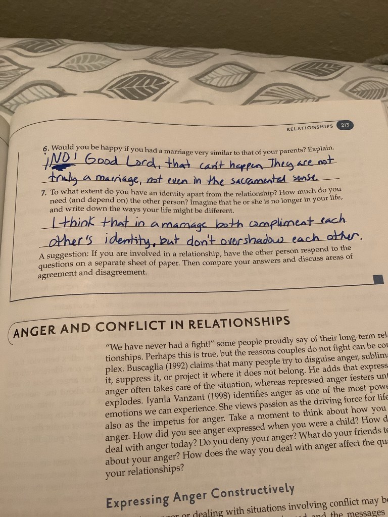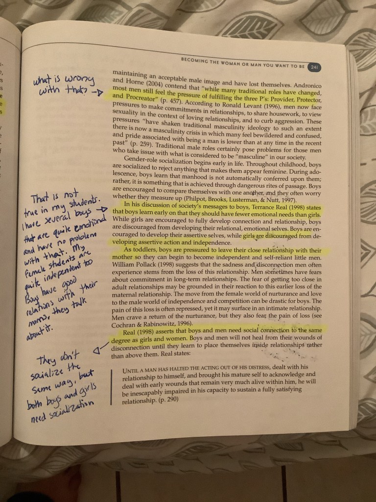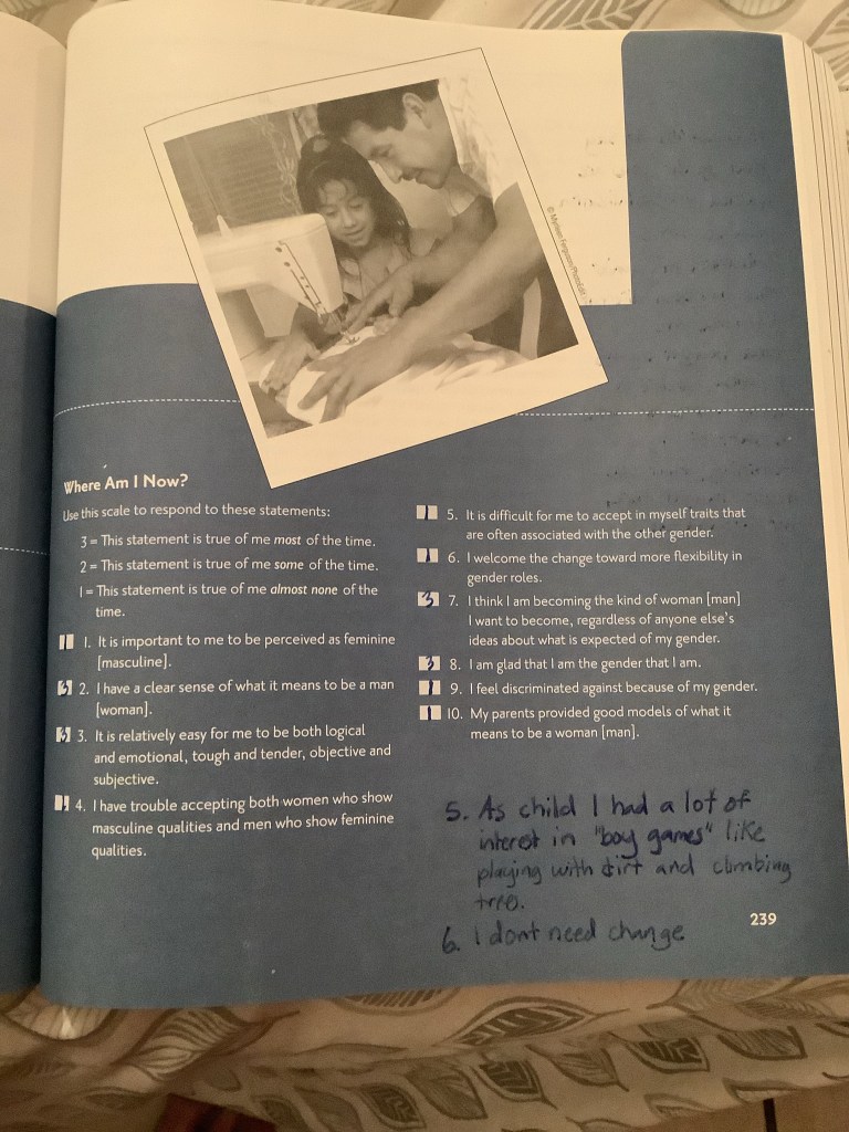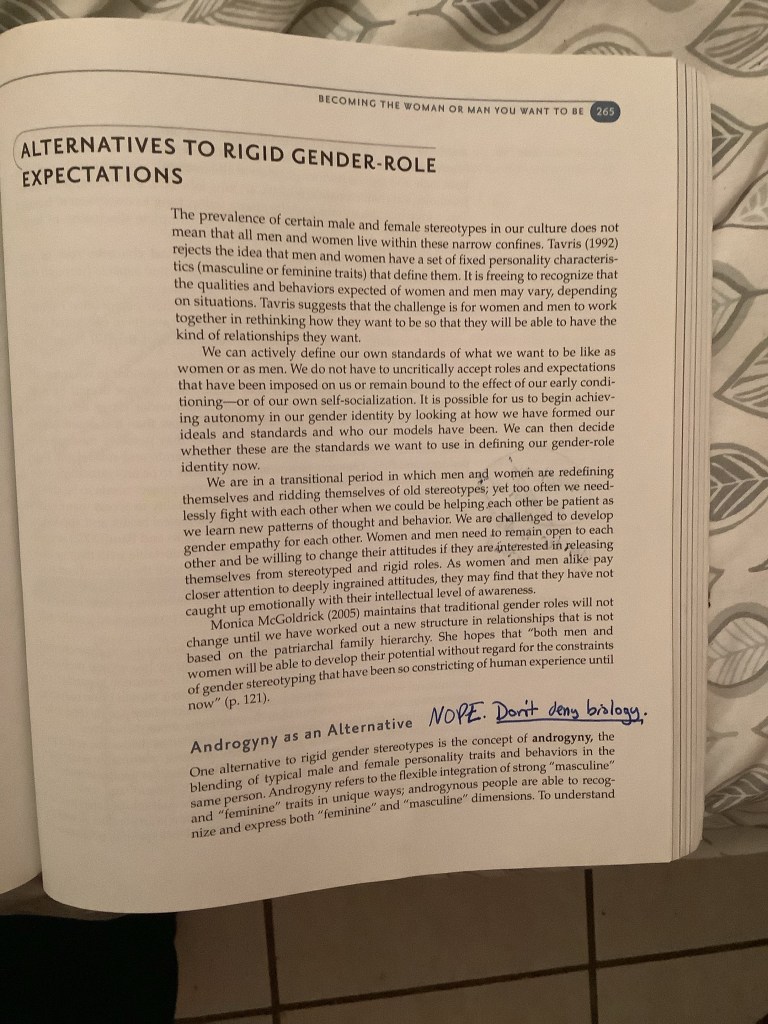 I jumped the whole section of gay and lesbian relationships. I knew the ideological would come sooner or after. Here it is. It is not discrimination: it is against my religious freedom beliefs. I actually would read it if you have also a Christian relationship section. I see the book doesn’t have a Christian relationship section. That is the norm: ideologically imposse ideology of gender. I am sure more recent editions of the books also include transgender relationships/identities. There is no need to add that to a book about personal growth.