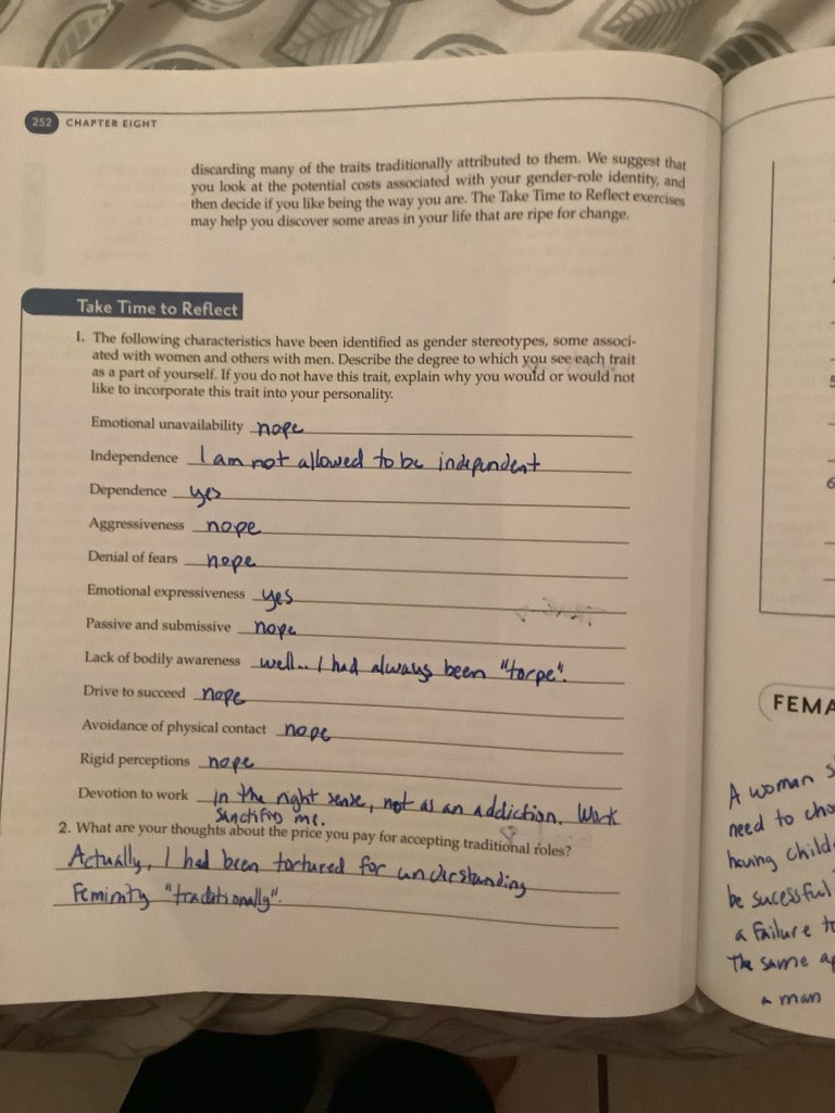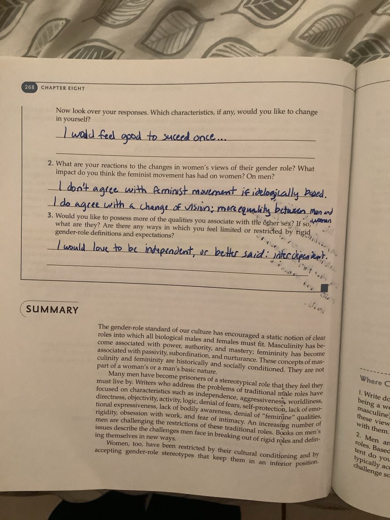 “Write down the characteristics you associate with being a woman (or femenine) and being a man (or masculine). Then think about how you adquired these views and to what degree you are satisfied with them”