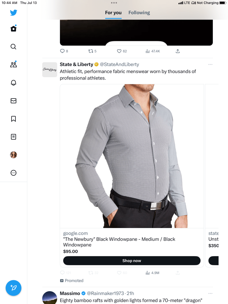 You Tube no es el único que proyecta la temática de Eduardo Verstegui. Luego de haber escrito todo lo anterior Twitter claramente ignoró mi posición respecto a Eduardo Verastegui. Pusieron en Twitter un anuncio de ropa atlética masculina. Díganme, ¿para qué me interesa la ropa masculina, sin ningún hombre en mi vida? ¿Debo asumir inconscientemente que hay un hombre atlético en mi vida, de la misma forma que en su momento dije que me atraían los brazos atléticos y fuertes?