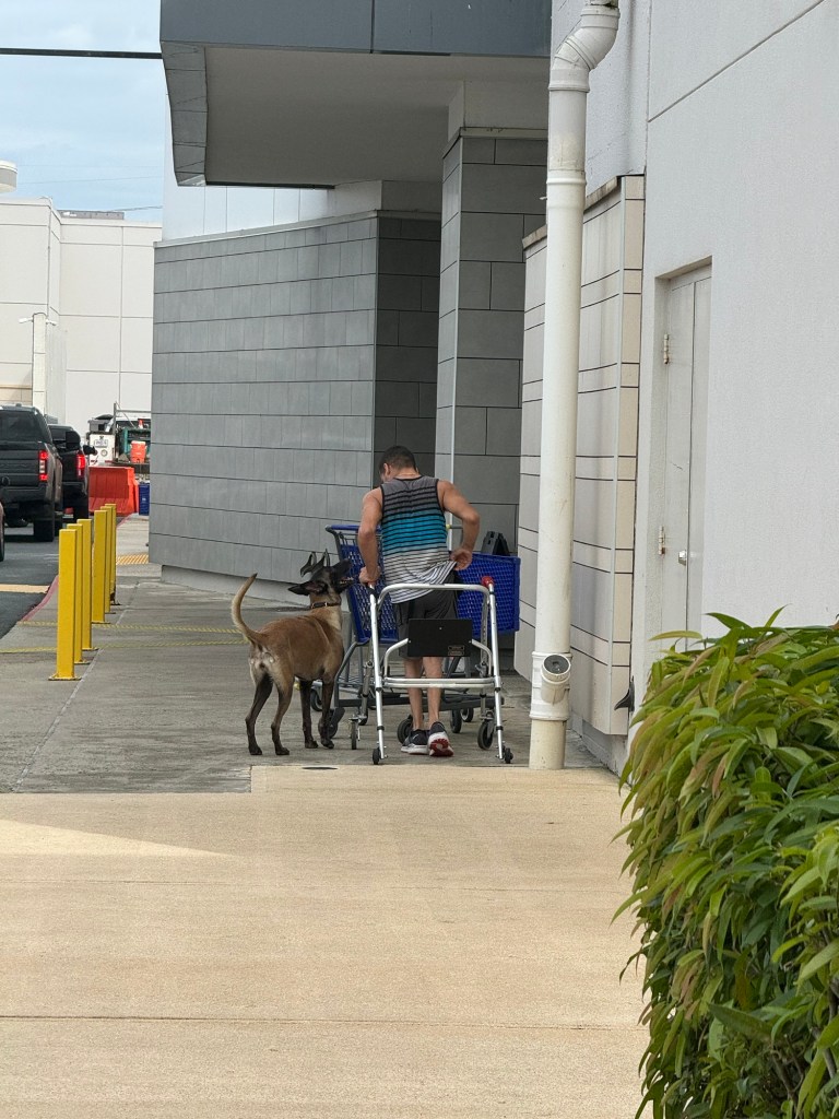 Other thing that is very commonly done around me is placing people with difficulties walking around me. Here it is, this time a person with a walker besides a dog, while I was walking to Marshalls.